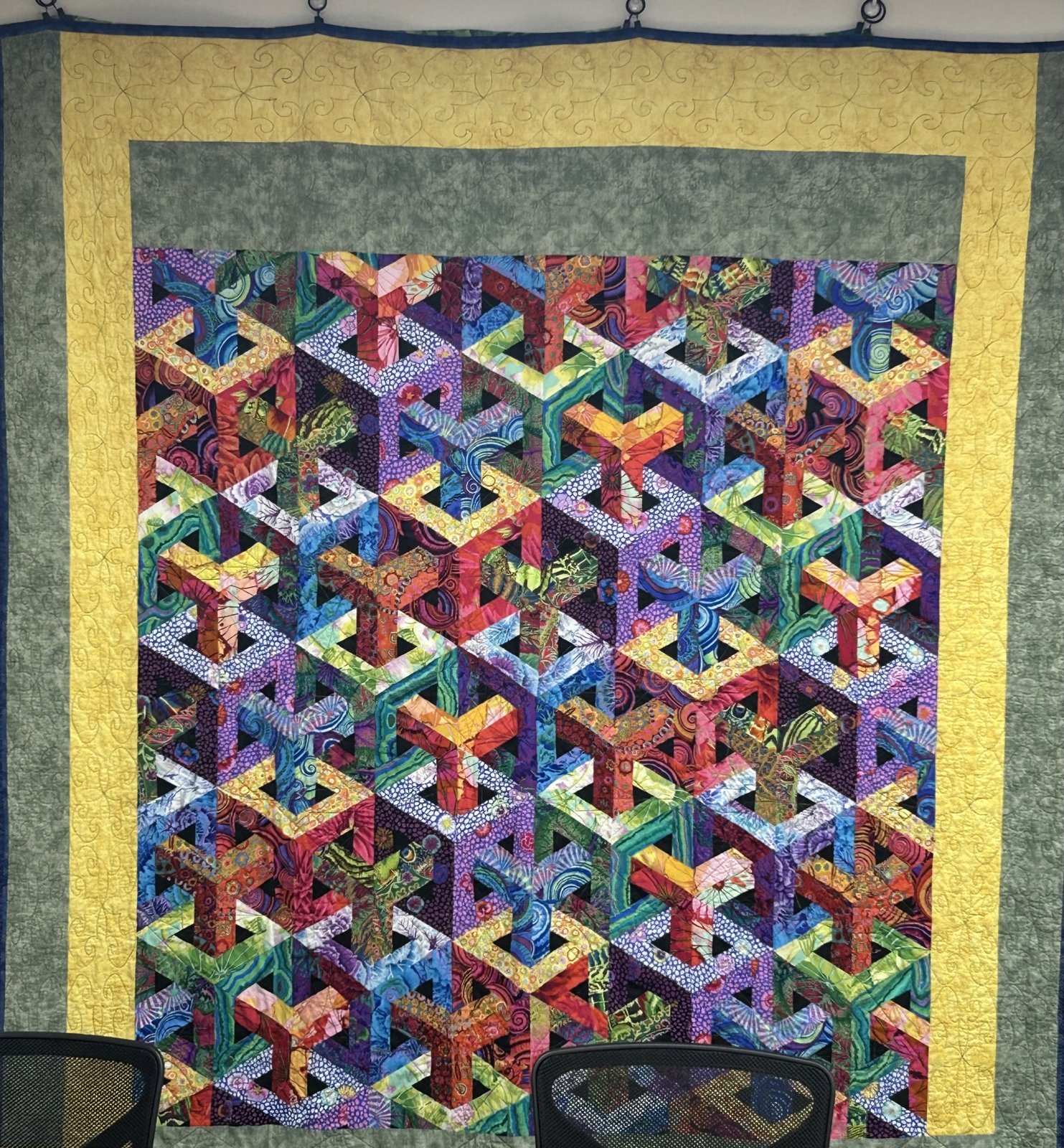 | Requirements: | Supplies needed: 60 degree,equilateral triangle, 8 different fabric colors and a light,medium,and dark of each color for a total of 24 different pieces of fabric. 1/3 of a yard of each plus a 1/2 yard of a very dark accent fabric. Length wise snack baggies,ziplock makes them, also, either alphabet pins or home made card stock alphabets to label fabrics and triangles. Rotary cutter, mat and small iron if you have one Prior to class, cut all of your fabric into 2 inch strip s and the accent fabric into 7 2 inch strips. The directions will be provided at the first class. Please come prepared as this quilt is involved. |