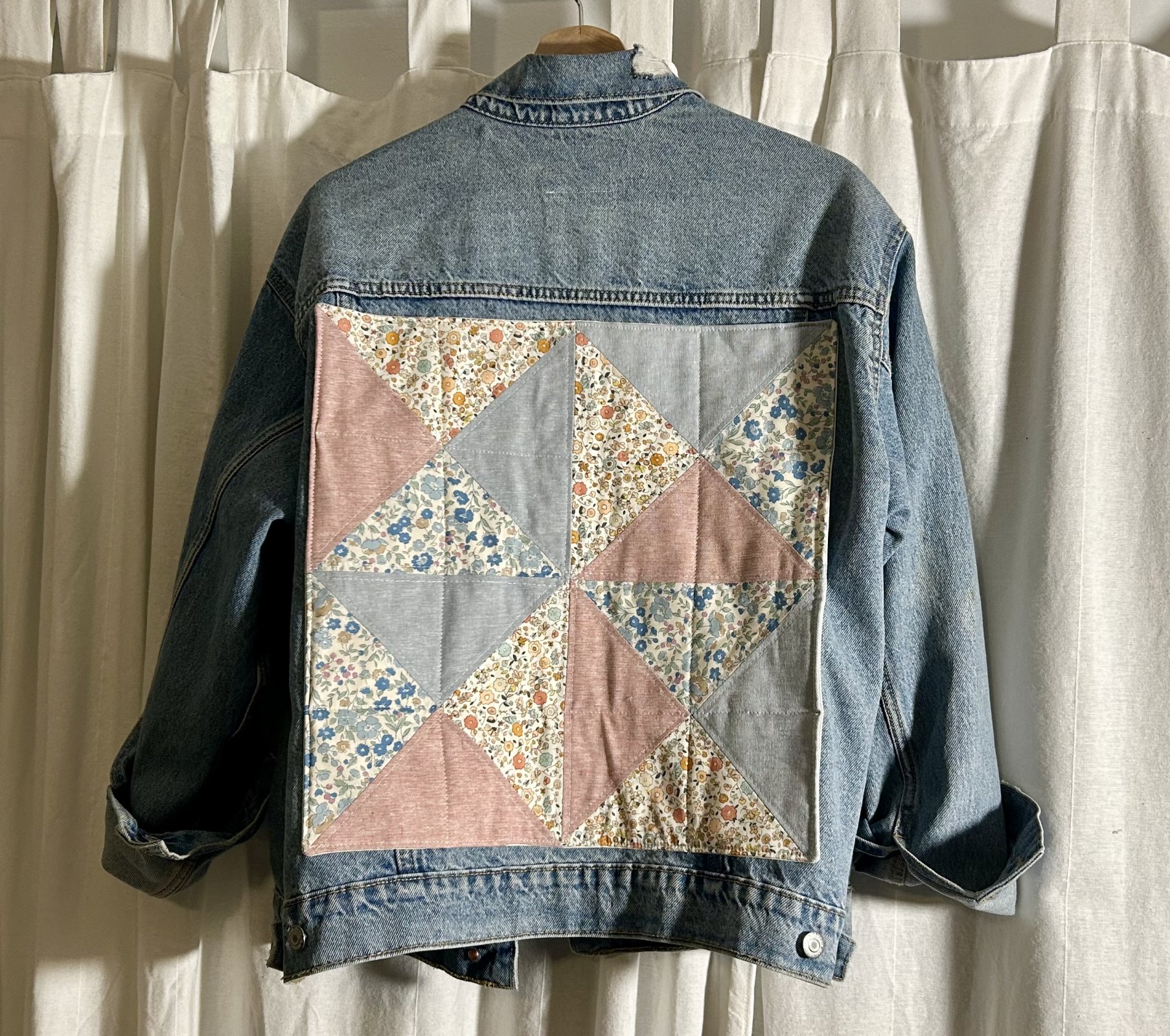 | Requirements: | Required materials: Jean jacket, Jeans needle, Approximately 1/2 yard of assorted fabric for the patchwork design, Fat quarter of backing fabric (will not show), Approximately 20” x 20” thin batting (cotton recommended), All-purpose thread, Basting spray or safety pins |