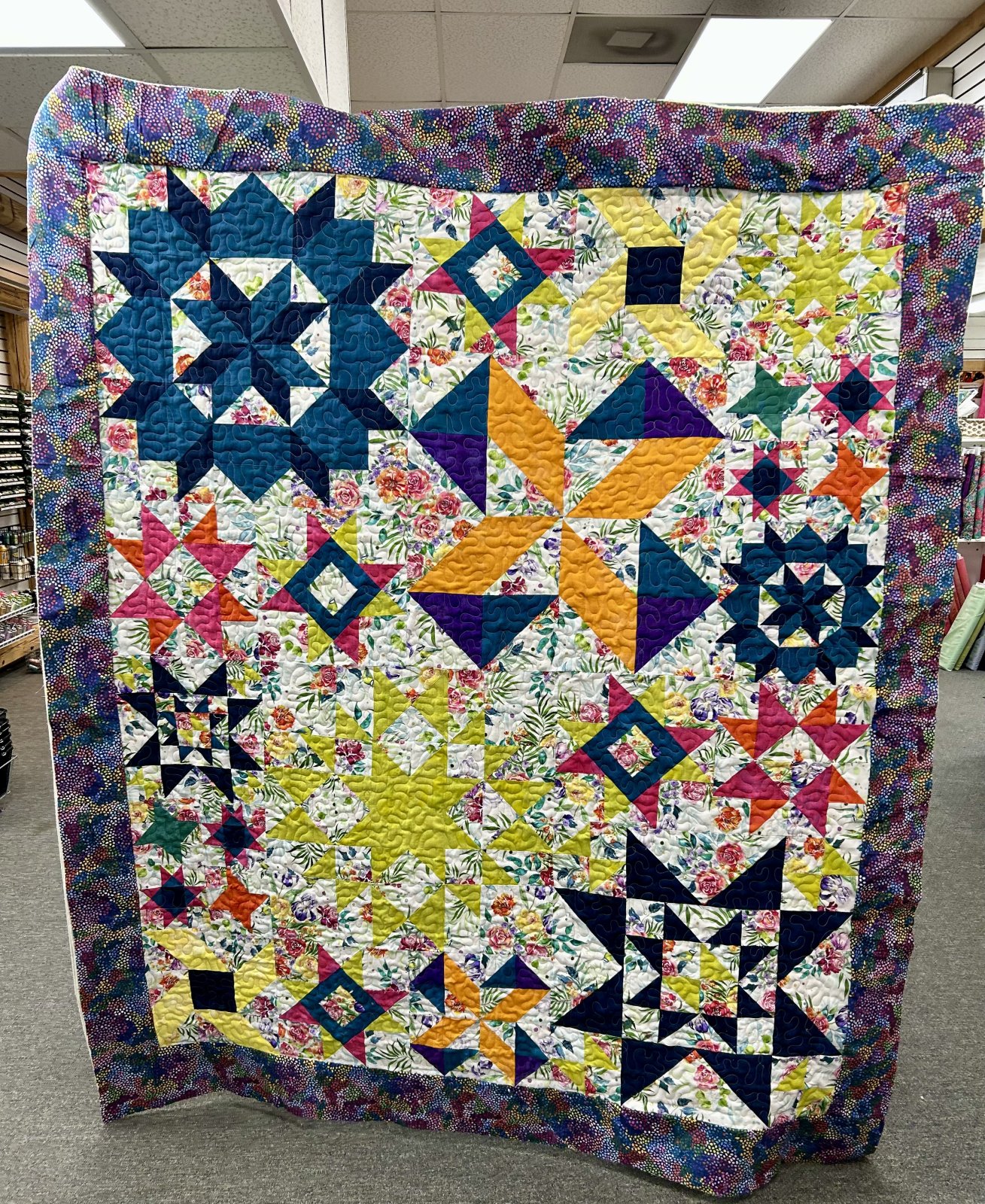 I will be teaching this as two blocks in a month since there are duplicates in small and large sizes. The layout repeats the same star block in two sizes but utilizes multiple finished block sizes—24", 12", and 6"—to create a complex, sampler-style appearance. the 4th class is optional if you want to do the layout.